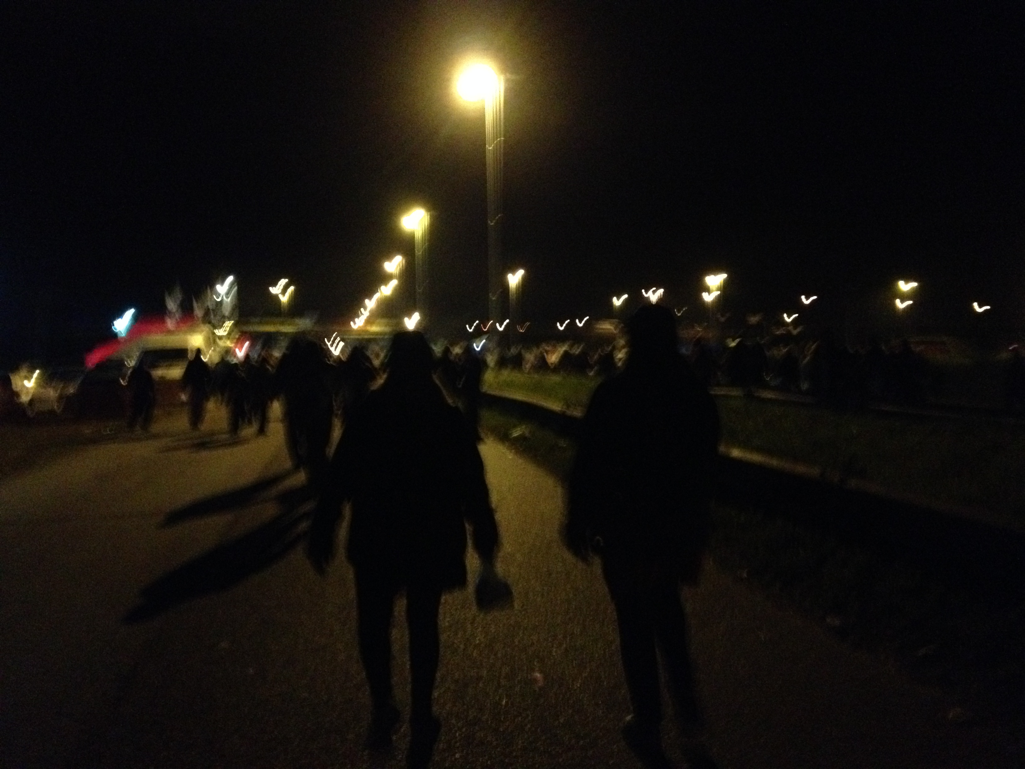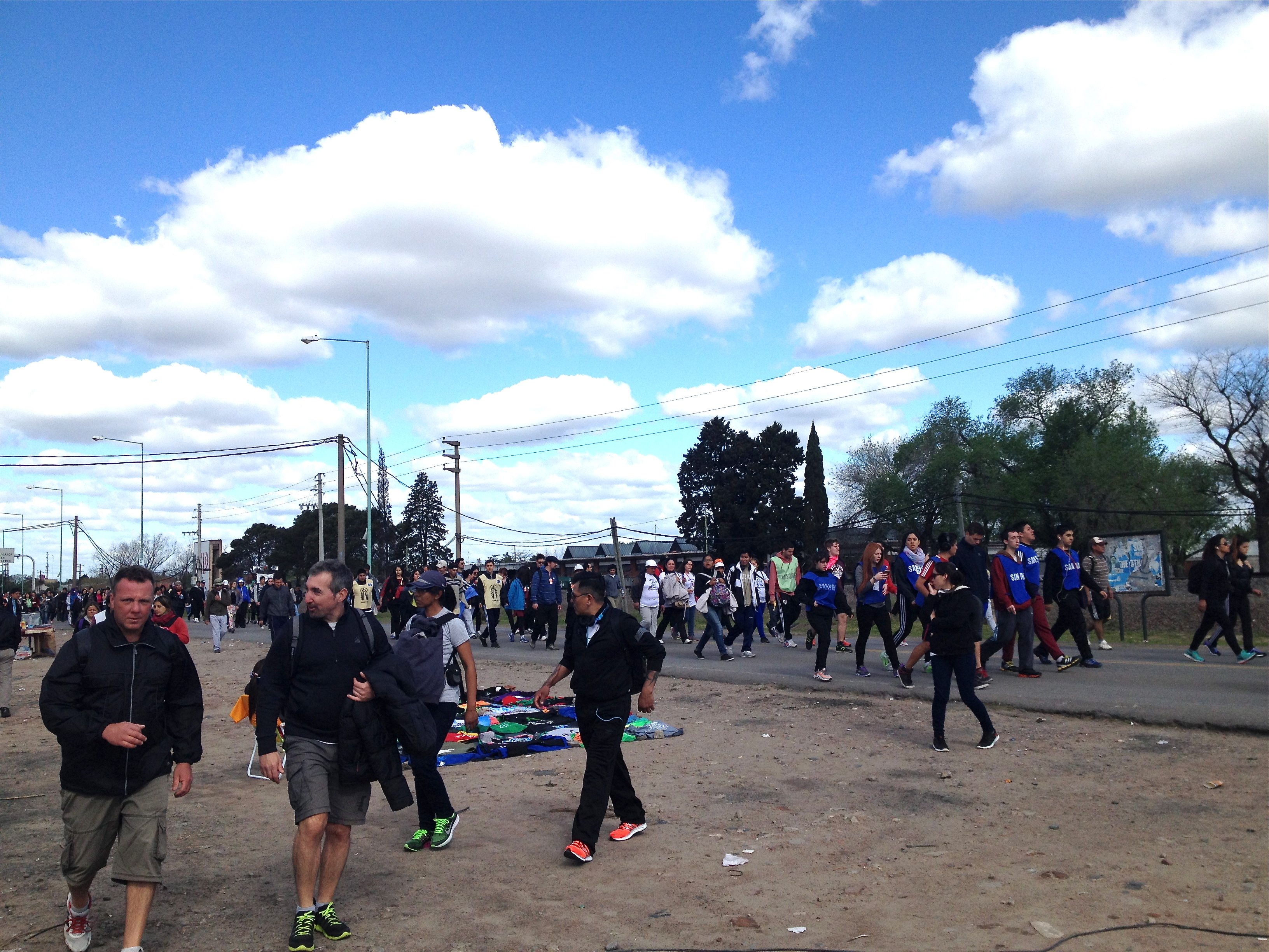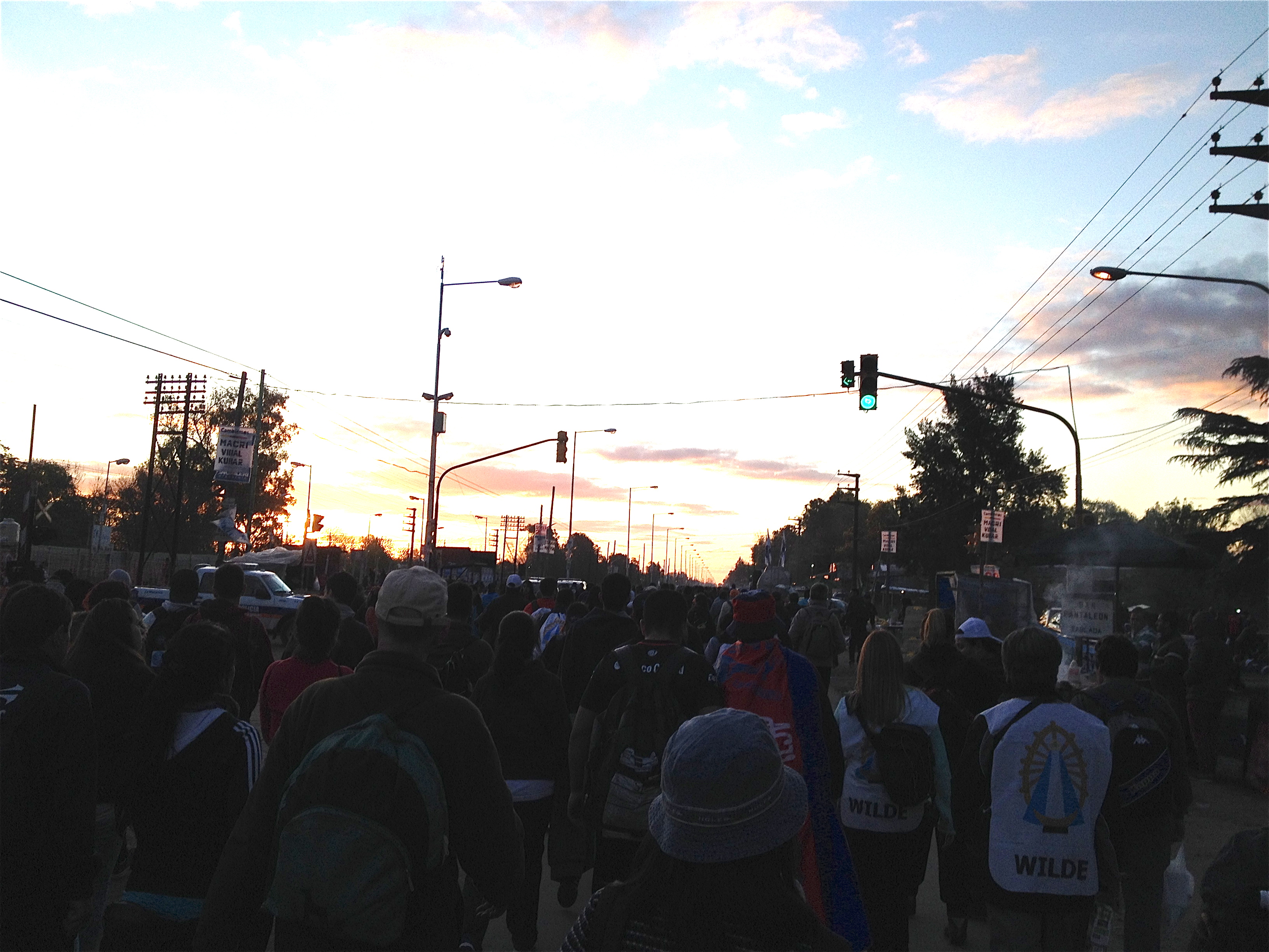 Die Beine werden schwer wie Blei und die Füsse schmerzen, doch wir laufen weiter und tausend andere mit uns. Auch als die Sonne beginnt unterzugehen und die Nacht einbricht. Auf dem Weg reichen einem die Helfer der verschiedenen Pfarreien gegen den Abend Matetee und heissen Bouillon, den wir ohne anzuhalten dankbar annehmen, denn jedes Anhalten lässt die Beine noch schwerer erscheinen. Auch Taufen und Segnungen werden angeboten. Überall am Wegrand dehnen Leute oder machen eine Pause. Je später es wird und je näher man an das Ziel herankommt, desto mehr schmerzverzerrte Gesichter sieht man. Einige ziehen die Schuhe aus, weil sie sie nicht mehr aushalten, andere hinken oder werden sogar links und rechts gestützt, um weiterlaufen zu können. Doch man läuft weiter… oder viele zumindest.