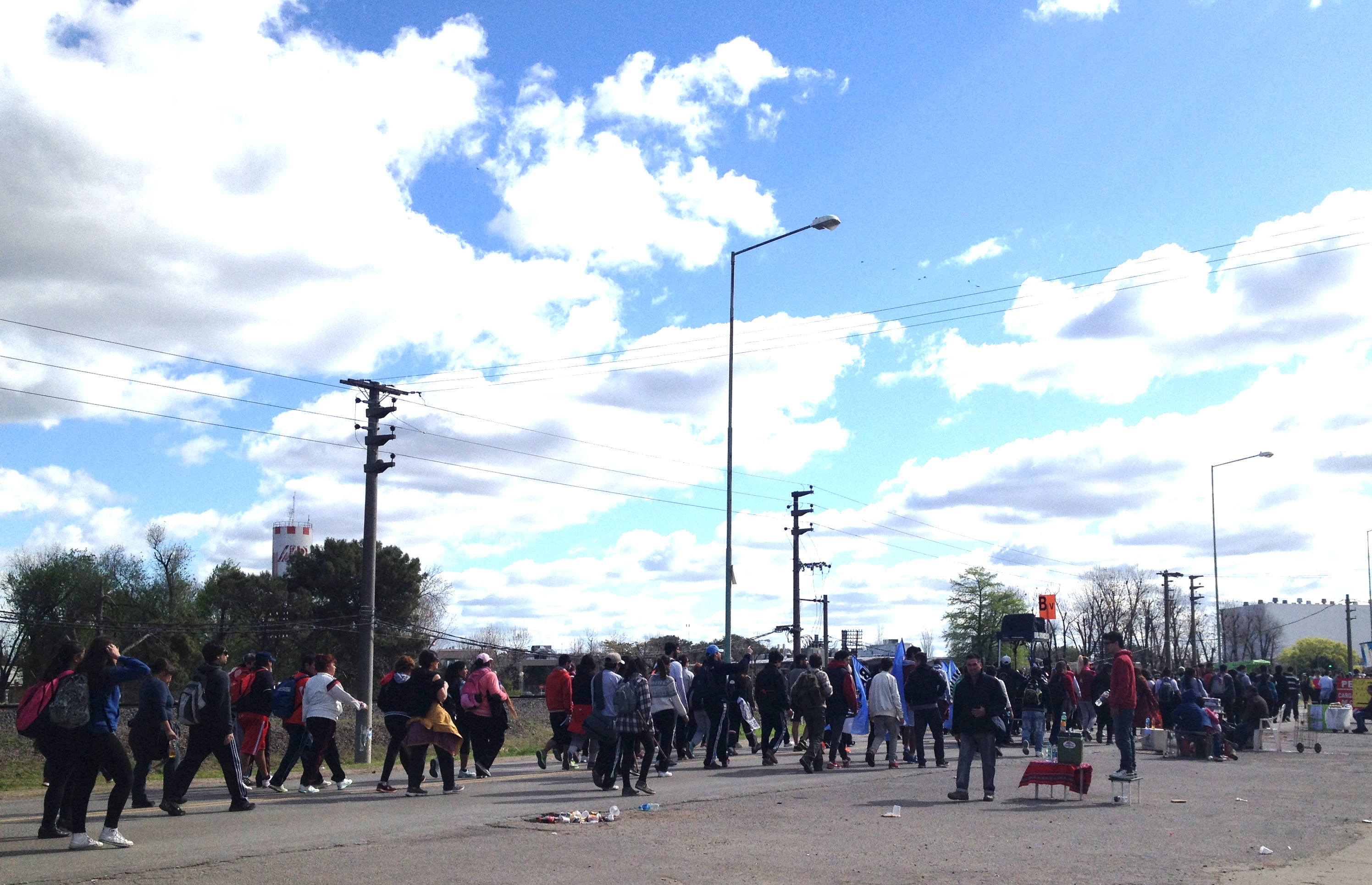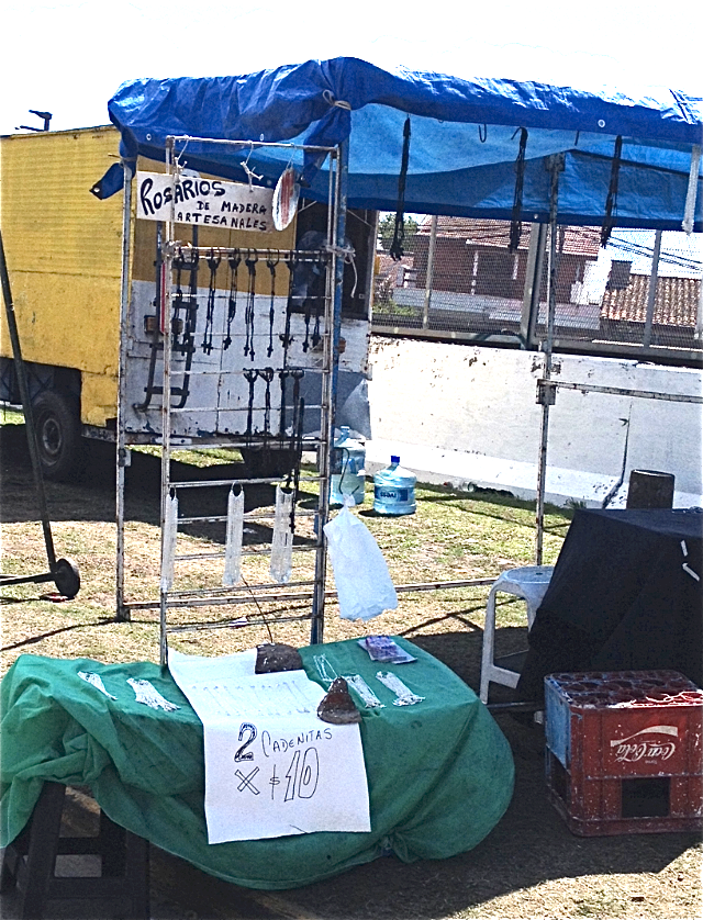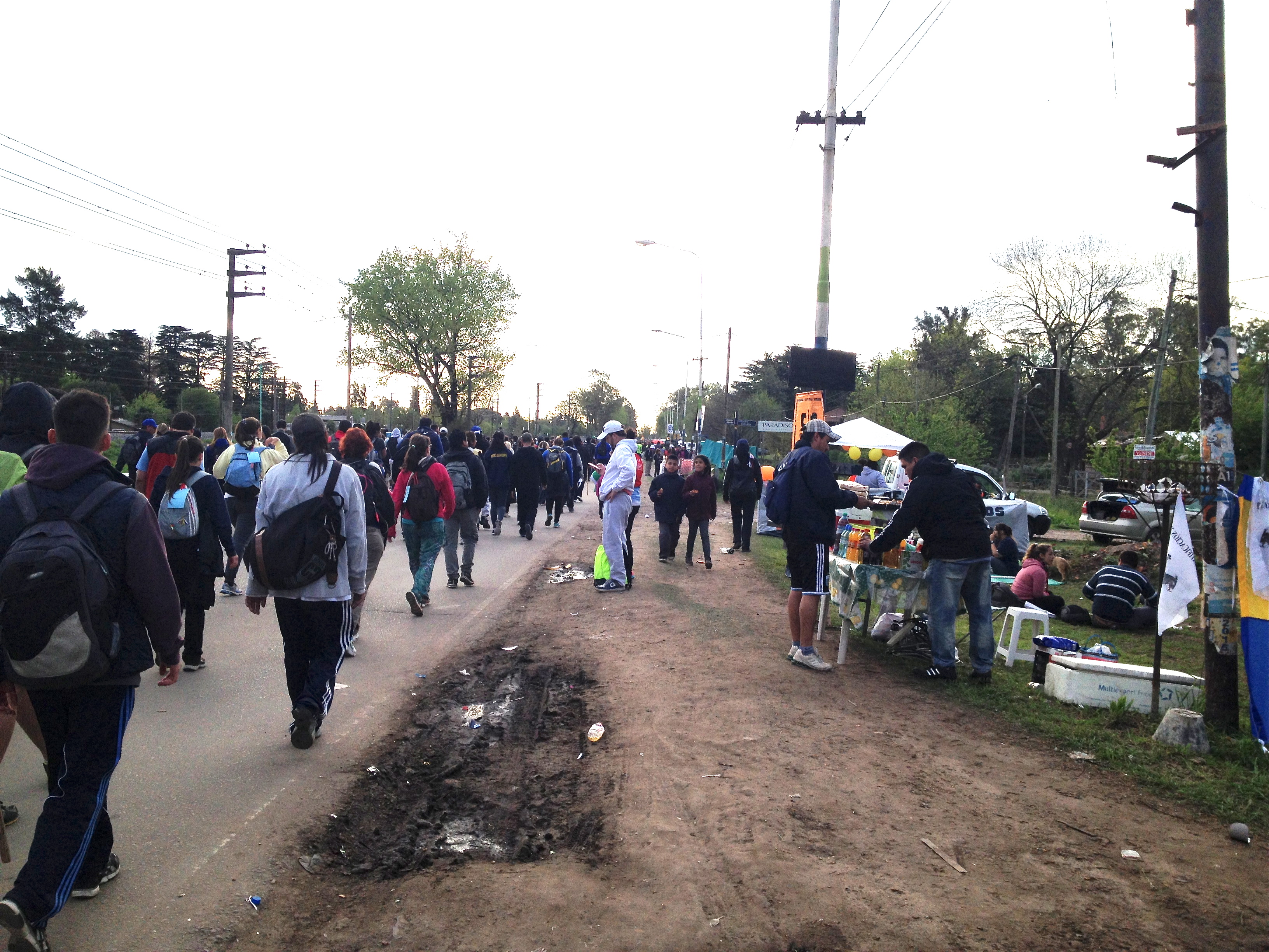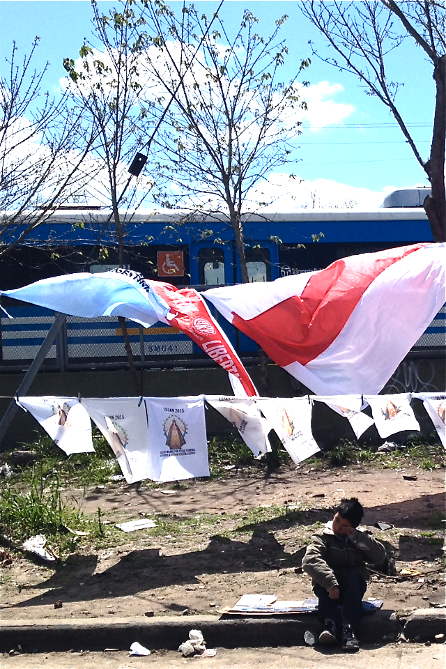 Am Wegrand wird alles nur erdenkliche angeboten. Zwei Rosenkränze zum Preis von einem, Pflaster, Schuhe und Schuheinlagen, der Stock des Papstes für nur 12 Pesos, Fahnen von Fussballclubs und der Jungfrau Maria… Bananen, die reich an Kalium sind werden angepriesen. Damit komme man schneller in Luján an, wird geworben. Alle möglichen Getränke, Gebäcke, Früchte, Chips locken links und rechts. Die Anwohner stellen einen Tisch vor die Haustür und verkaufen hausgemachte Schnitzelsandwichs, Fruchtsalate und Kuchen. Jeder der eine Toilette hat, stellt sie natürlich gegen Bezahlung, den Pilgern zur Verfügung. Und das Geschäft läuft – denn Toiletten sind heissbegehrt, vor allem bei den Frauen, die scharenweise Schlange stehen.