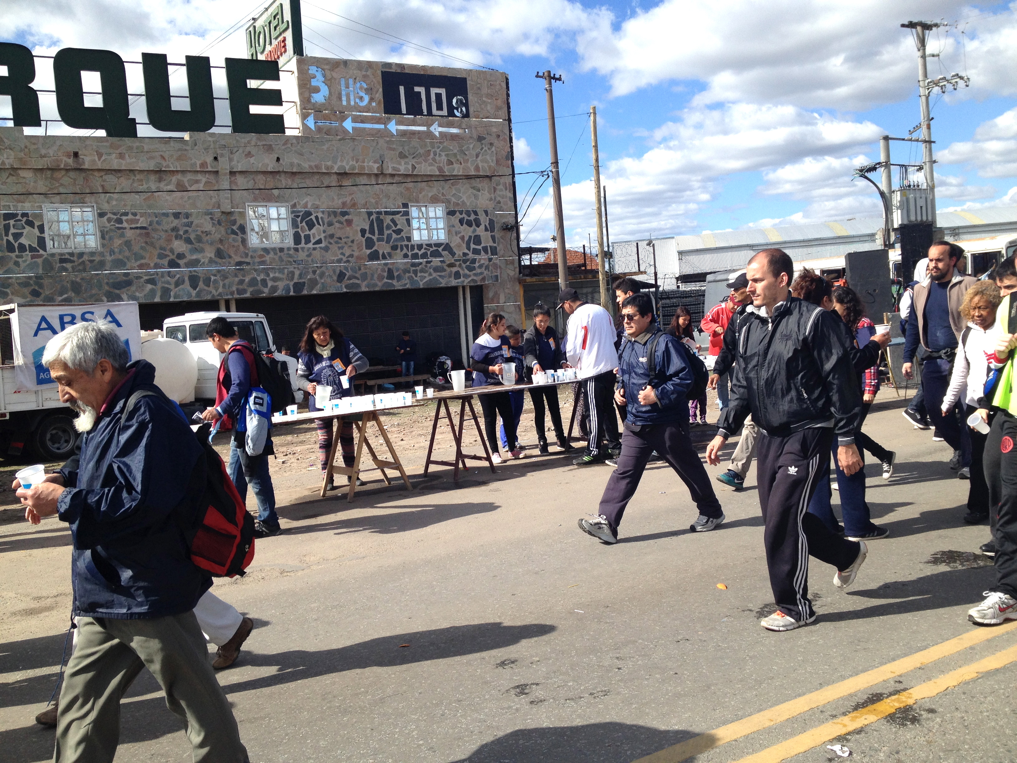 Die meisten Leute und so auch wir, gehen mit einer Gruppe aus einer Pfarrei auf die Pilgerung. In den drei offiziellen Pausen in den Ortschaften Merlo, La Reja und Gral Rodríguez richten diese Verpflegungsstationen ein. Dort kann man sich setzen und ausruhen. Die Freiwilligen bringen den Pilgern zu essen und zu trinken, verarzten schmerzende Füsse, massieren die Beine und bauen die Moral auf: „Komm, du schaffst es! Weiter so! Es ist fast geschafft!“. Wenn du es in einem guten Zustand bis nach Gral Rodríguez schaffst, schaffst du es auch nach Luján, heisst es. Wenn man in Gral Rodríguez ankommt ist es bereits Nacht und man ist bereits etwa 10 Stunden gelaufen und „Es ist fast geschafft“ heisst konkret: Es fehlen „nur“ noch ca. vier Stunden bis zur Basilika. Fast 60km sind es bis zum Ziel und wir laufen sie in etwa 14 Stunden. Die Pausen sollten möglichst nicht länger als 30 Minuten dauern, sonst wird es sehr schwierig weiter zu gehen.
