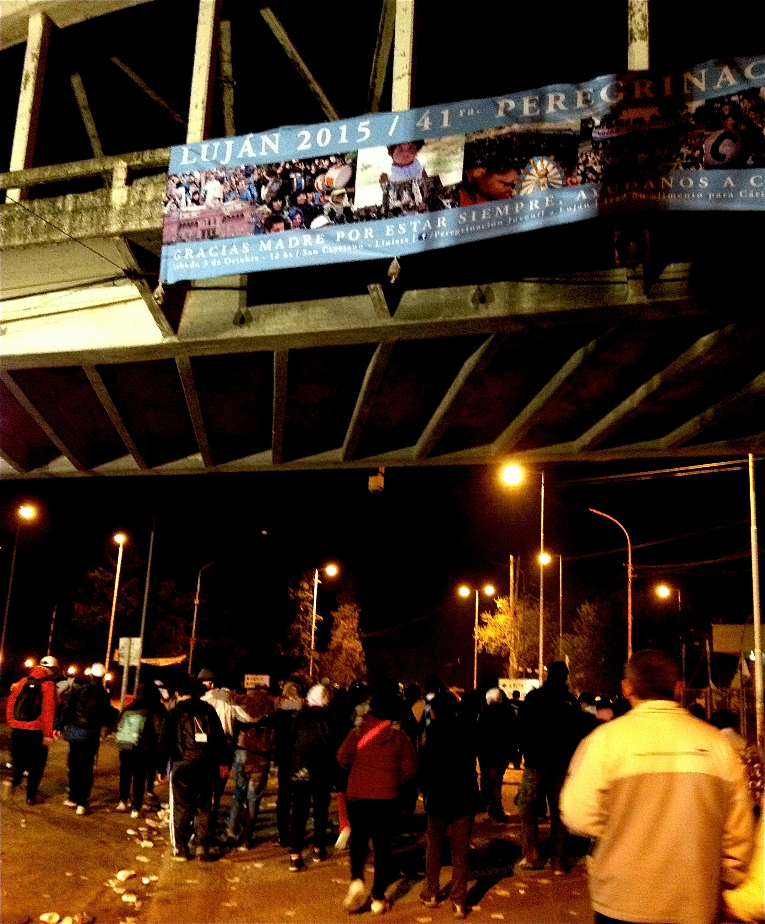 Mit der Dunkelheit, wird der Pilgerstrom ruhiger. Die Müdigkeit dämpft die Stimmung etwas. Es gibt einen Stromausfall und wir laufen eine Weile im Stockfinsteren weiter. Je näher man ans Ziel kommt, desto mehr lebt die Menschenmasse allmählich wieder auf. Es scheint so, als bekämen die meisten Leute einen Energieschub, wenn sie in die Stadt Luján hineinkommen. Die Gebete und das Geschrei per Megaphon nehmen zu. Bei einigen der „Animateure“ fragen wir uns, ob sie irgendwelche Drogen konsumieren. Je näher man der Basilika kommt, desto enger werden die Strassen und Gassen durch die sich die Menschenmasse drängt und das Tempo verlangsamt sich gezwungenermassen.