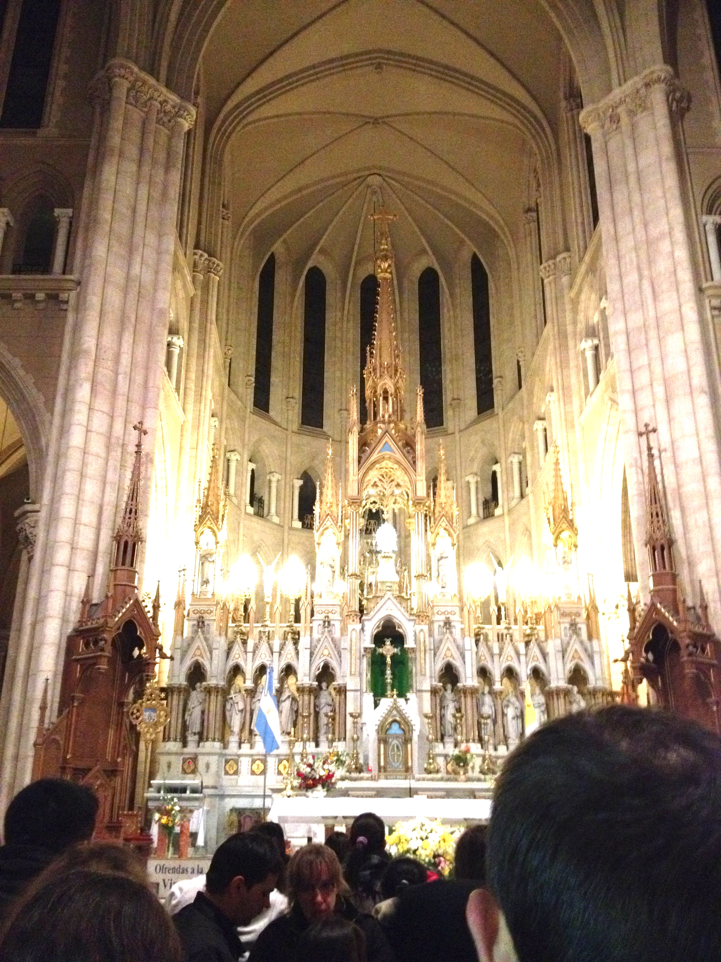 Um punkt Mitternacht erreichen wir schliesslich die Basilica de Nuestra Señora de Luján. Viele Pilger brechen in Tränen aus wenn sie ankommen. Auch ich bin sehr berührt. Erschöpft nach der enormen physischen und psychischen Anstrengung überkommen einen unweigerlich eine Welle von unterschiedlichen Gefühlen und Gedanken. Es ist wundervoll es geschafft zu haben. In der Kirche wird gebetet, gebeichtet, fotografiert. Viele legen sich irgendwo auf den Boden hin und schlafen, um am nächsten Tag der Messe beiwohnen zu können. Wir werden vom Pfarrer, der zwischen der einen und der anderen Segnung der Menschenmasse zuruft, sie solle doch bitte zirkulieren, mit Weihwasser bespritzt.