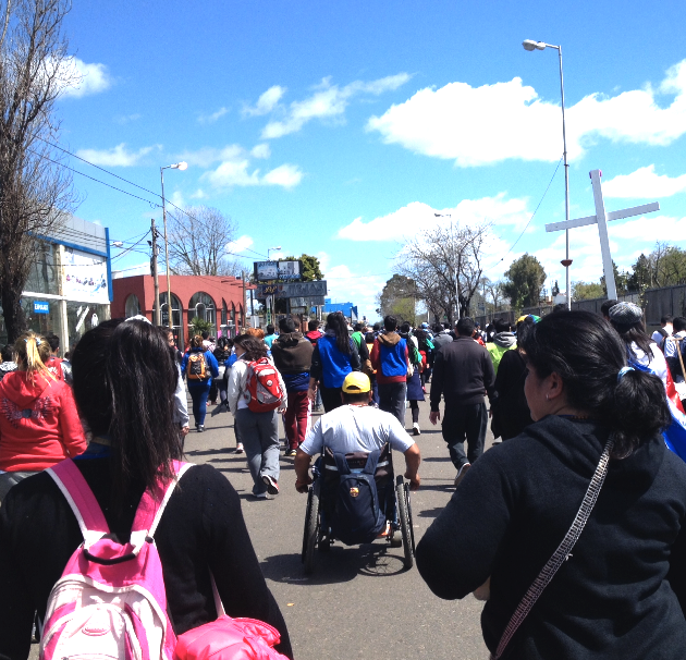 Junge, Alte, Menschen in Rollstühlen, allein, in Gruppen, still, schwatzend, singend, schnell, langsam, in Markenturnschuhen, in Flipflops, barfuss, mit Stöcken oder ohne, betend, scherzend, in sich gekehrt… Alles läuft und lebt, auf und neben dem Weg. Immer wieder mal trällert laute Musik aus mehr oder weniger guten Musikboxen, die auf Wägen von einigen Gruppen gezogen werden. Einmal ist es Cumbia, dann sind es religiöse Lieder. Teils bekommt man Lust mitzusingen und zu tanzen, teils sich die Ohren zu zuhalten. Einige der Kirchengruppen animieren die Pilger mit Megaphonen, machen Witze, feuern an, beten oder singen Lieder. Nicht wenige der Lieder kennt man aus dem Fussballstadion, nur die Texte wurden etwas abgeändert.
